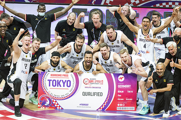 Die DBB-Auswahl bejubelt die Olympia-Qualifikation mit einem Gruppenfoto hinter [...]